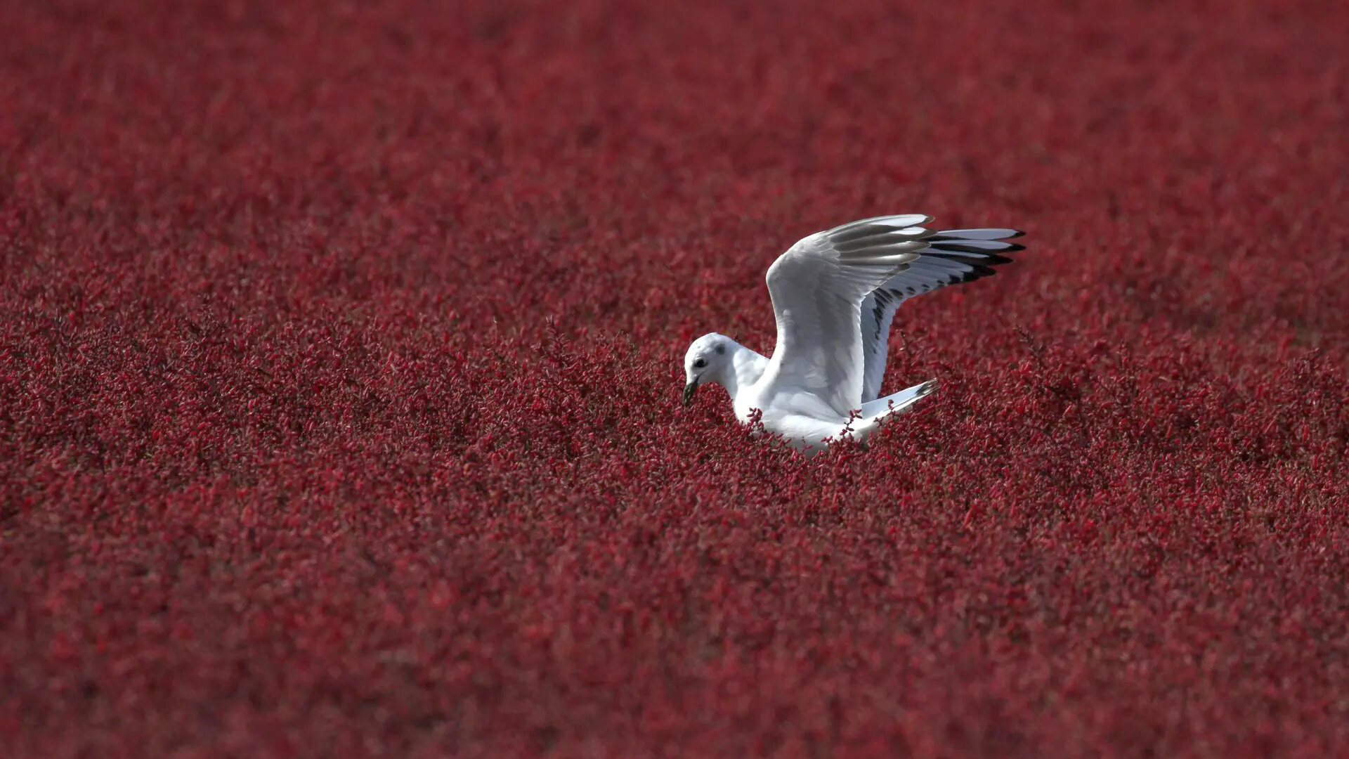 - Seagull sits on the ‘red beach‘ created by clusters of suaeda salsa also known as seepweed or seablite, Yingkou, China.jpg