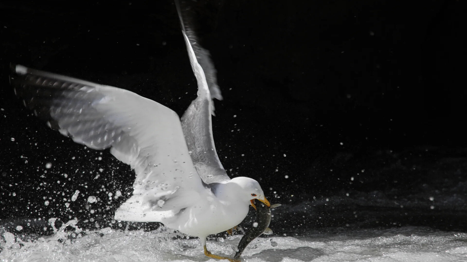 Seagull catches a Pearl Mullet (Alburnus tarichi) at Pearl Mullet Nature Park, Van, Turkey